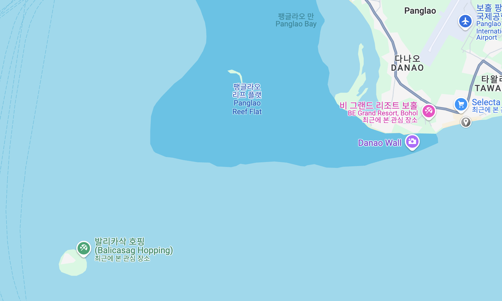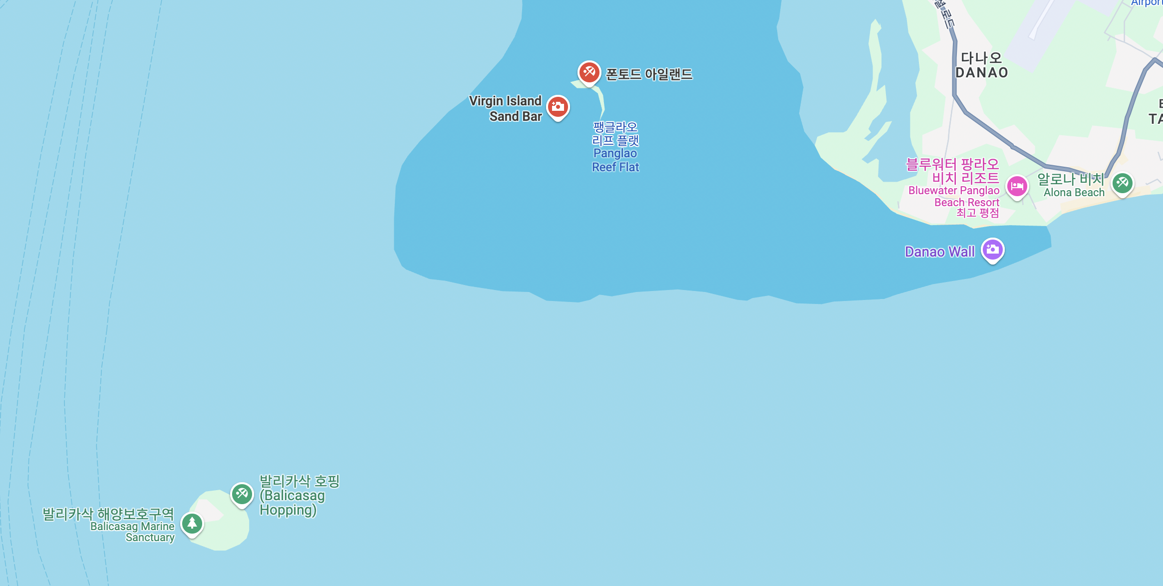 오른쪽 회색으로 찍은 포인트가 알로나 비치이니 거기서 부터 발리카삭 섬까지 이동을 하니까요.