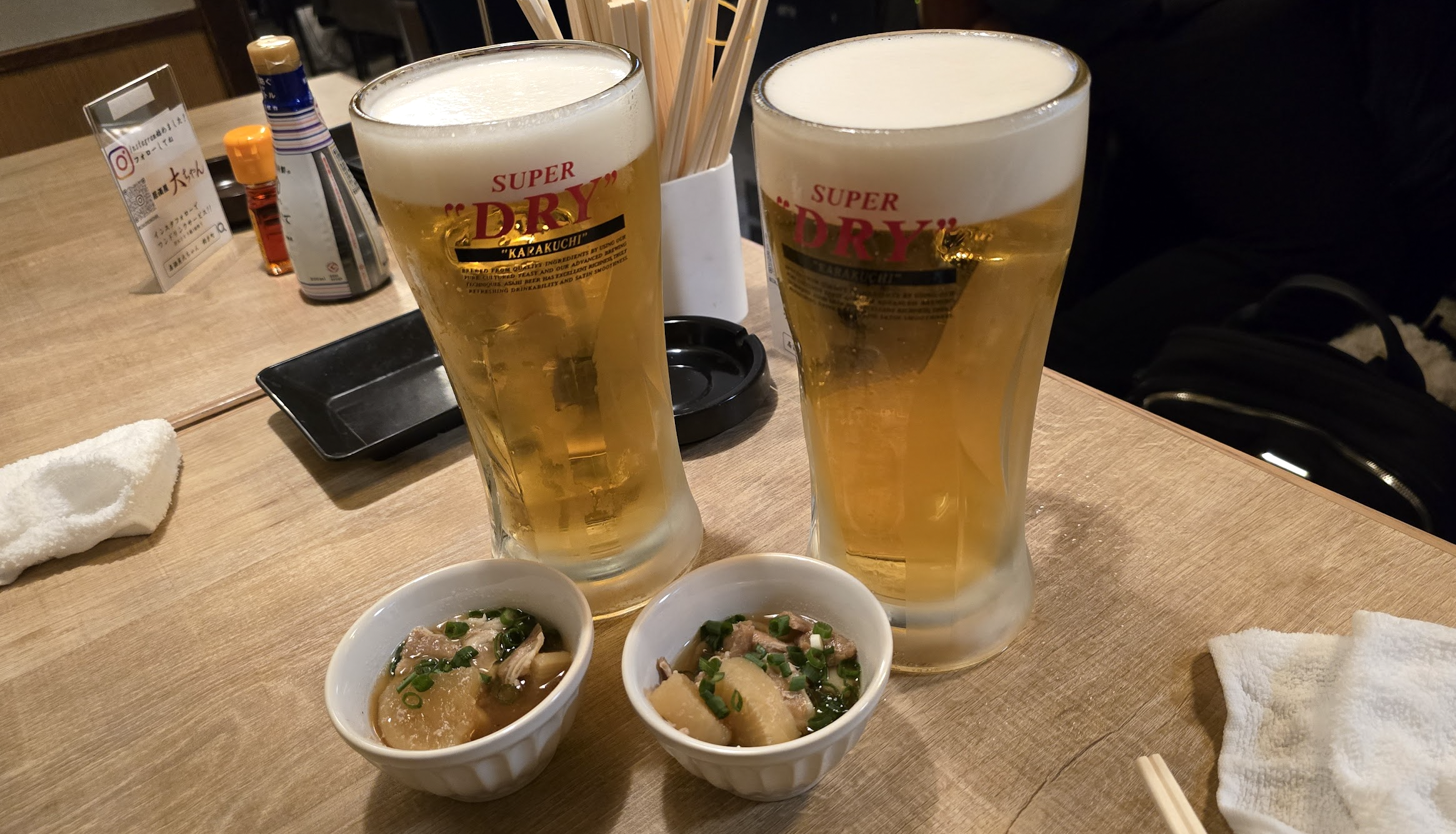 맥주 2잔과 야키토리 모둠?? 을 시켰습니다. 여기도 사장님이 너무 친절하시더라고요, 가게는 많이 좁은 곳이었지만 일본 감성이 있는 곳이라고 해야 할까.. 그리고 흡연이 가능한 곳이라서 바에서는 흡연을 하면서 혼자서 술 드시는 분들도 있기도 했습니다.