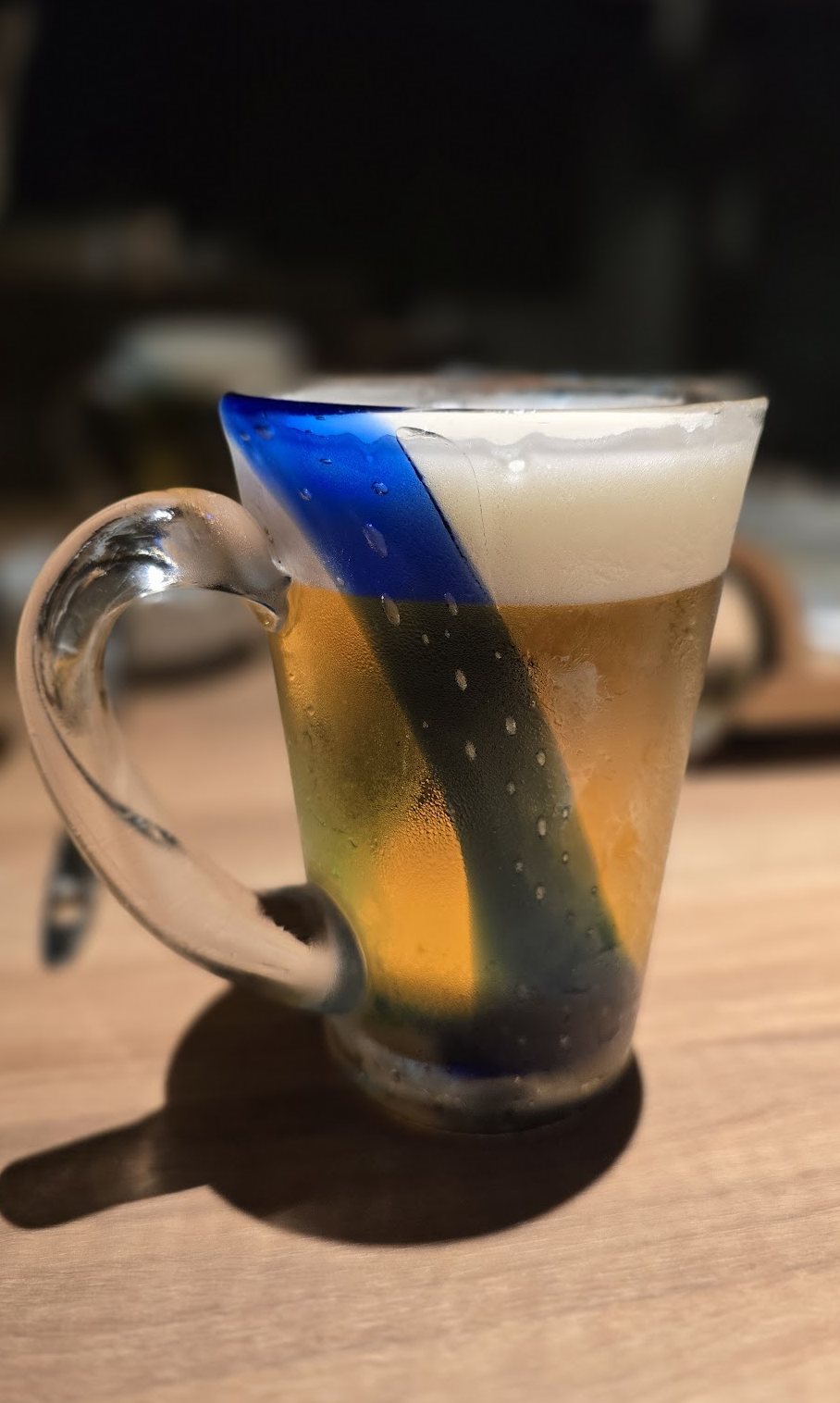 자리에 앉아 메뉴판을 보며 일행들과 적당한 가격대에서 코스를 주문했습니다. 그리고 빠질 수 없는 시원한 맥주 한 잔!